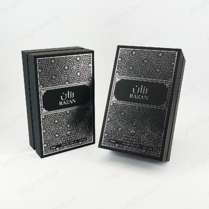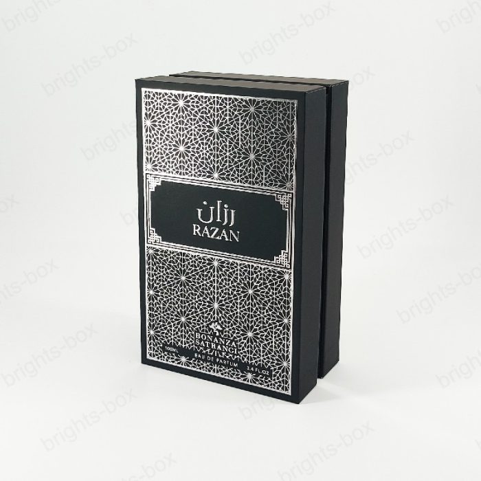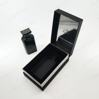 If you are searching for sustainable packaging, this box example may be your perfect fit. This box can hold a relatively large capacity of perfume, usually printed with a special embossed special paper for packaging, the front side is UV printed with a floral pattern and the name of the perfume is stamped in silver, which is very understated and luxurious.